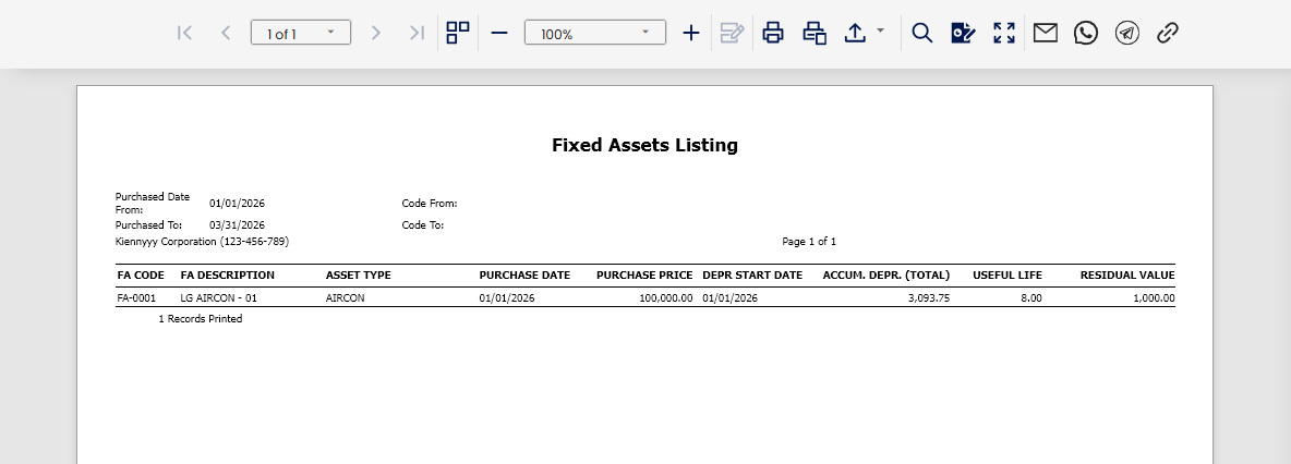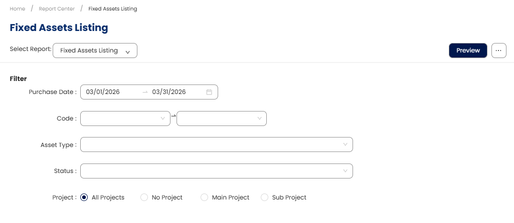 The Fixed Assets Listing report provides a detailed overview of all fixed assets recorded in the system. It tracks asset purchases, depreciation, useful life, and residual values. This report is essential for financial reporting, compliance, and asset management.