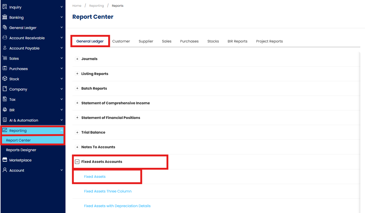 Navigate to Fixed Asset Listing. Go to Reporting > Report Center > General Ledger > Fixed Assets Accounts > Fixed Assets.