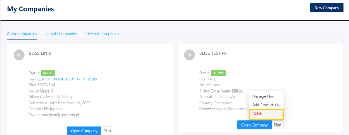 2. In My Companies > Active Companies. Click Plan > Delete.