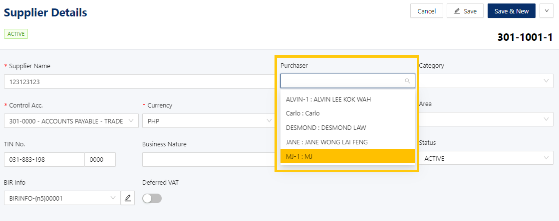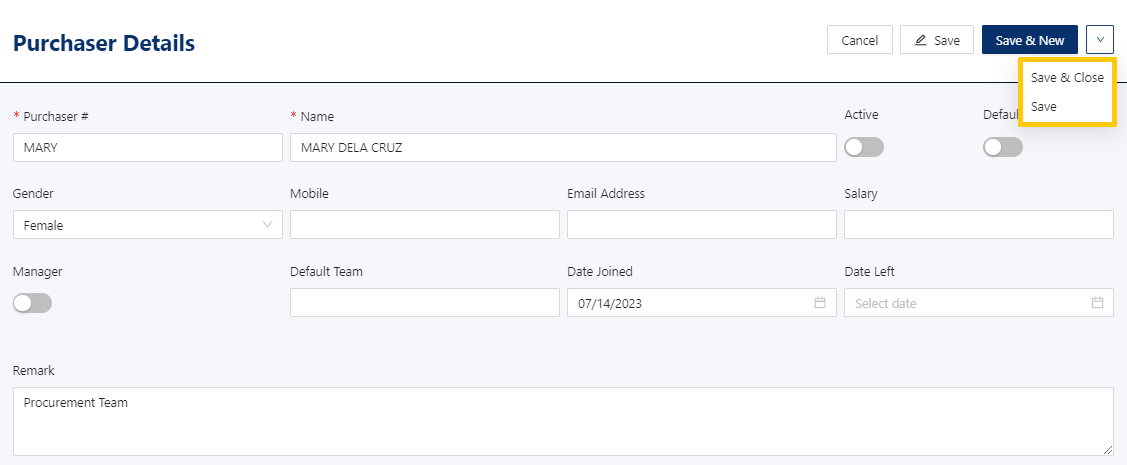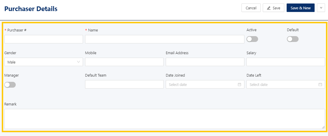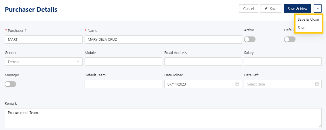 Active: This is a function to set if a purchaser is still used. If a purchaser will not be used anymore, disable the toggle to make it inactive.