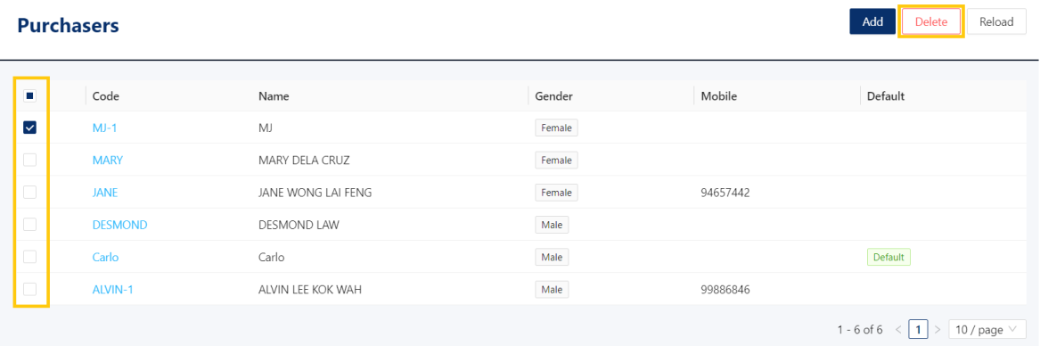 1. In Purchasers List View, tick existing purchaser then click Delete