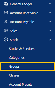 Groups is a form that allows you to maintain a type of group separate from the stock category and class to which each of your stock items belongs. This function can be used to generate inventory reports.