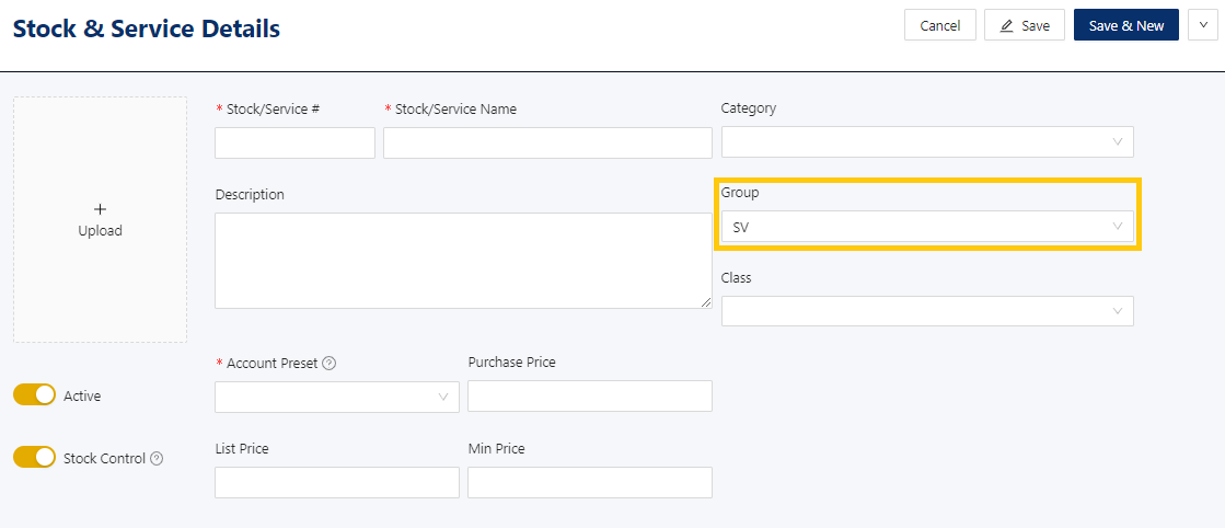 Group is now available for selection in Stock & Service Details