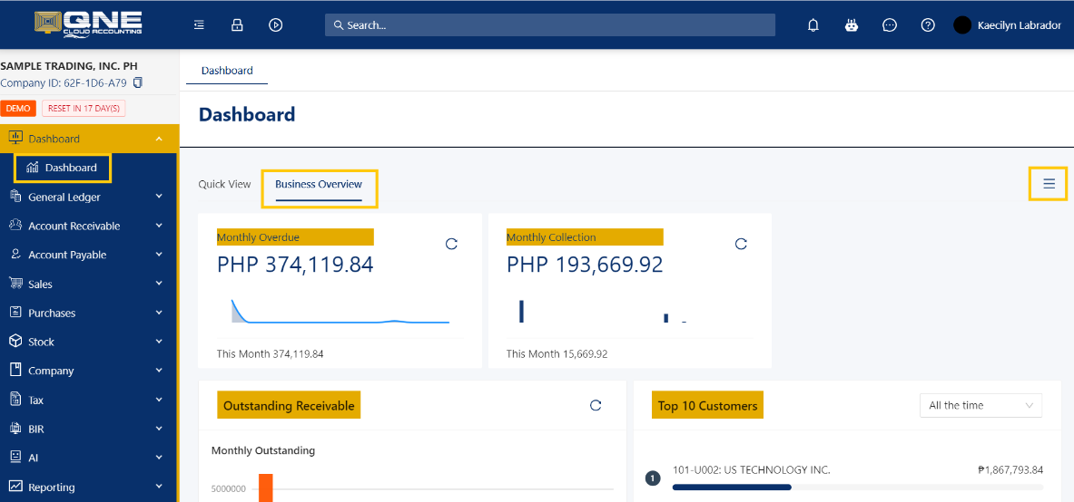 1. In the Navigation pane, go to Dashboard. Click the three lines located in the upper right corner of the screen.