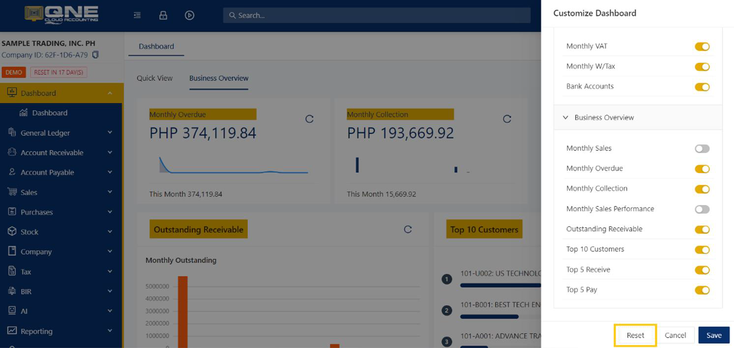 2. In the Customize Dashboard Pop-up box, click Reset.