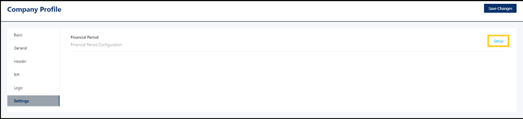 2. In Company Profile > Settings > Financial Period. Click Setup
