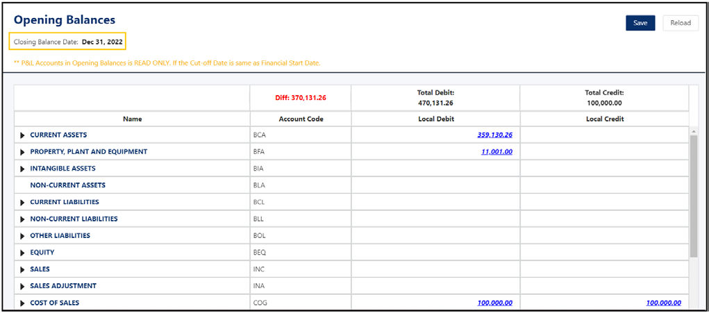 Cutoff Date: Basis of the Opening Balances or 1st Day of Live Transaction.