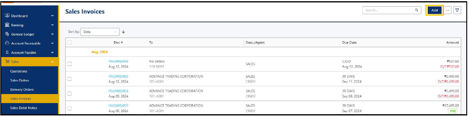 1. On the Navigation Pane> Sales and select Sales Invoices. Click ‘Add’ to create new transaction.
