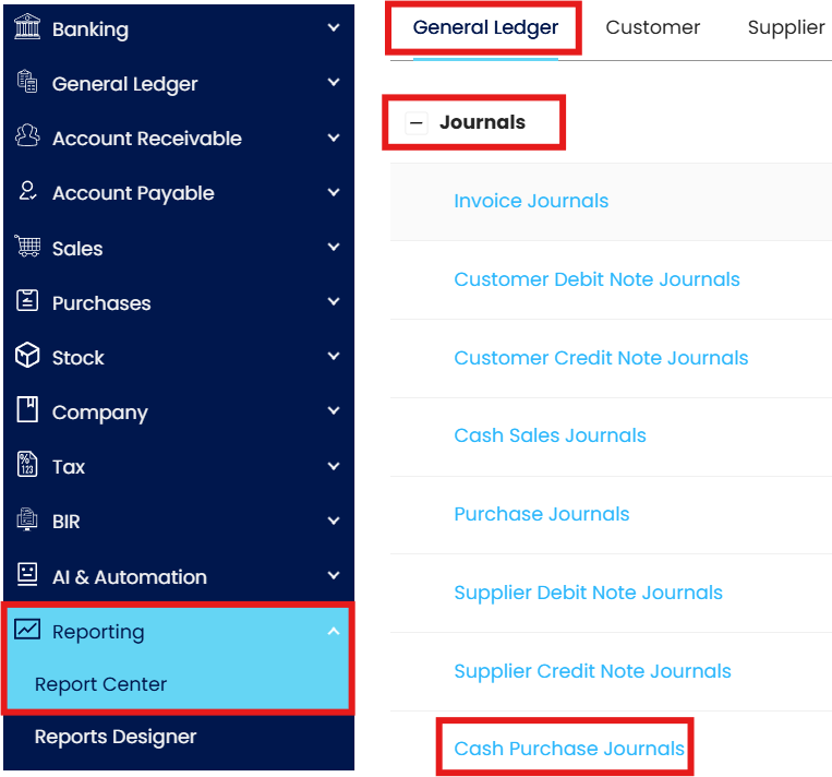 On the Navigation Pane, go to Reporting > Report Center. Under the General Ledger tab, click Journals > Cash Purchase Journals.