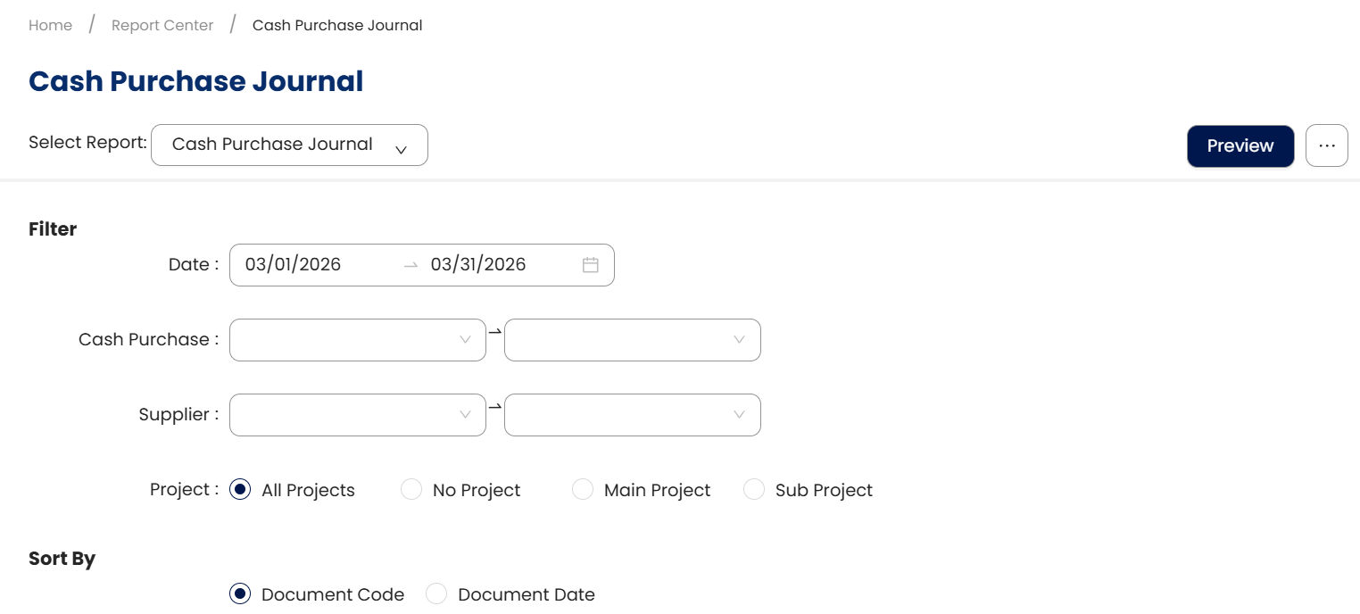 In the Cash Purchase Journal screen, set the parameters that will filter the generated report.