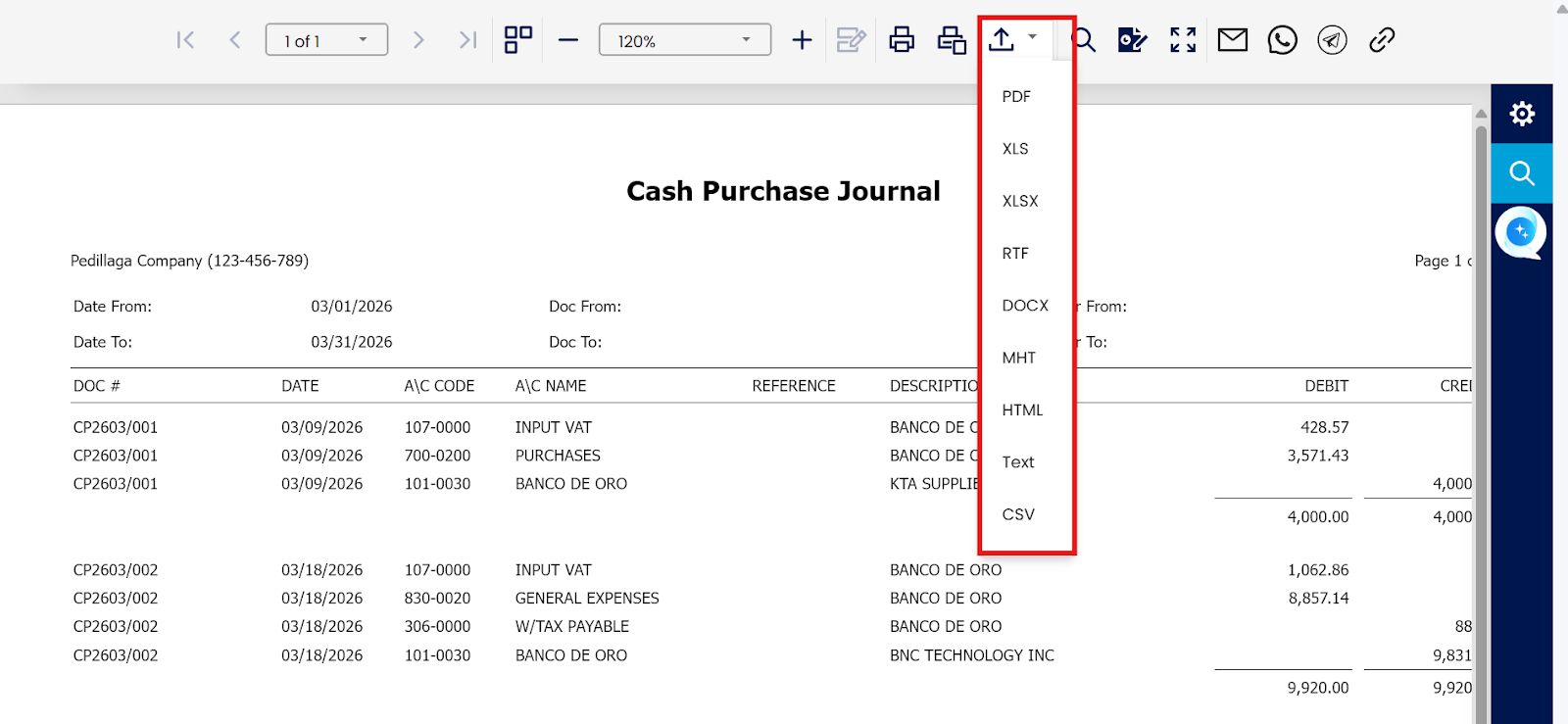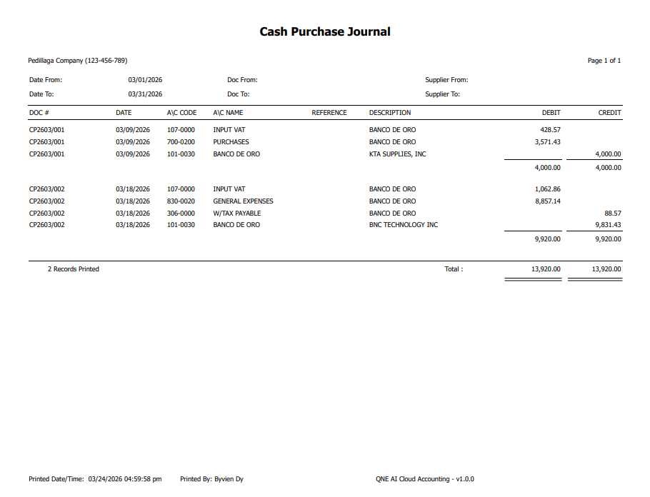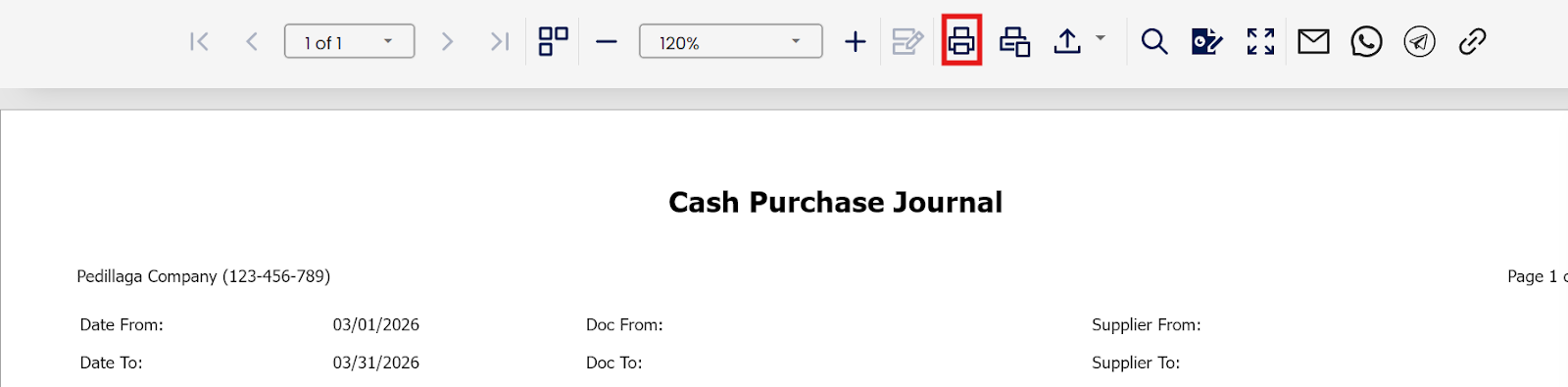 You can now view the generated Cash Purchase Journal report.