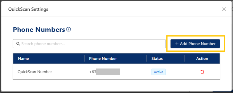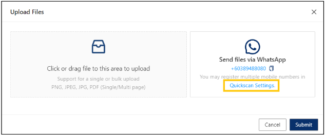 First, register a phone number under QuickScan Settings to upload files via WhatsApp. This registered number will enable the system to recognize and process files sent via WhatsApp.