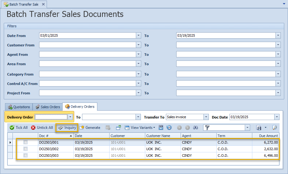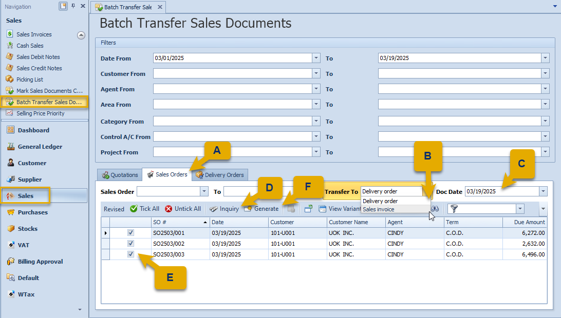1. Navigate to Sales > Batch Transfer Sales Document. In this form, users can filter records by Date, Customer, Agent, Area, Category, Control, and Project.
