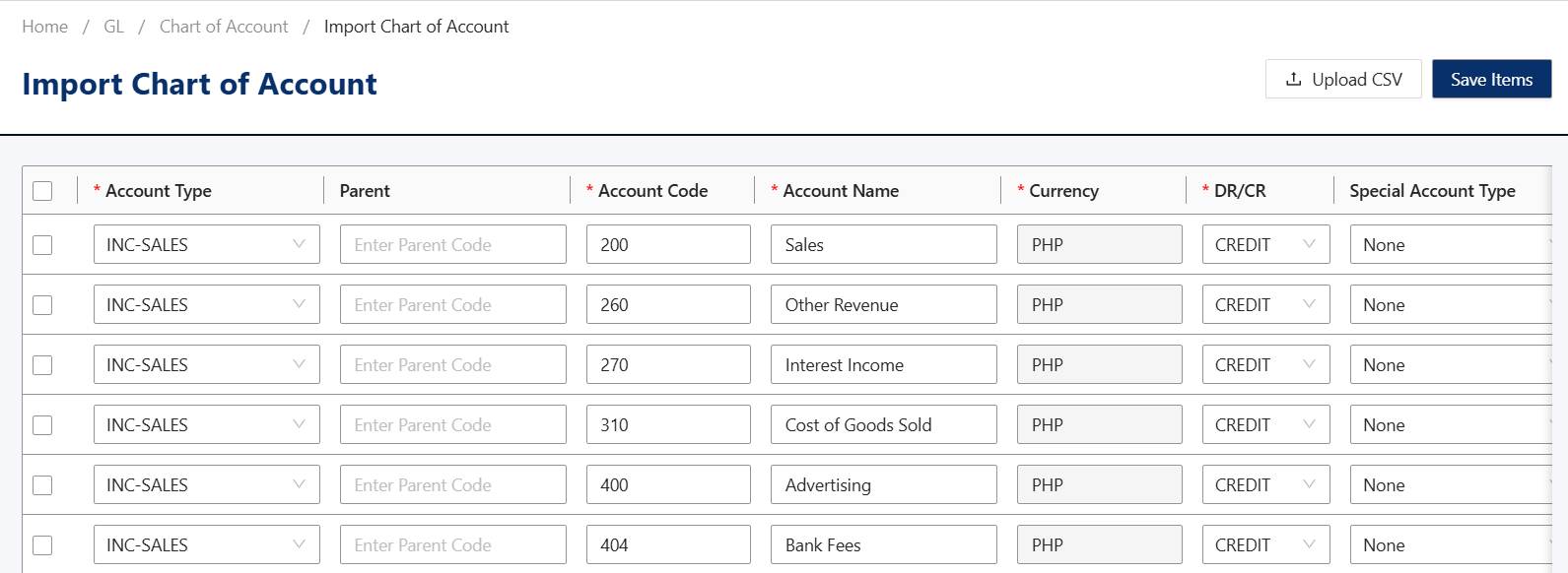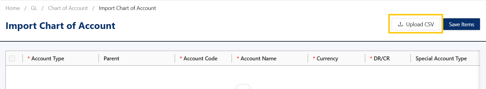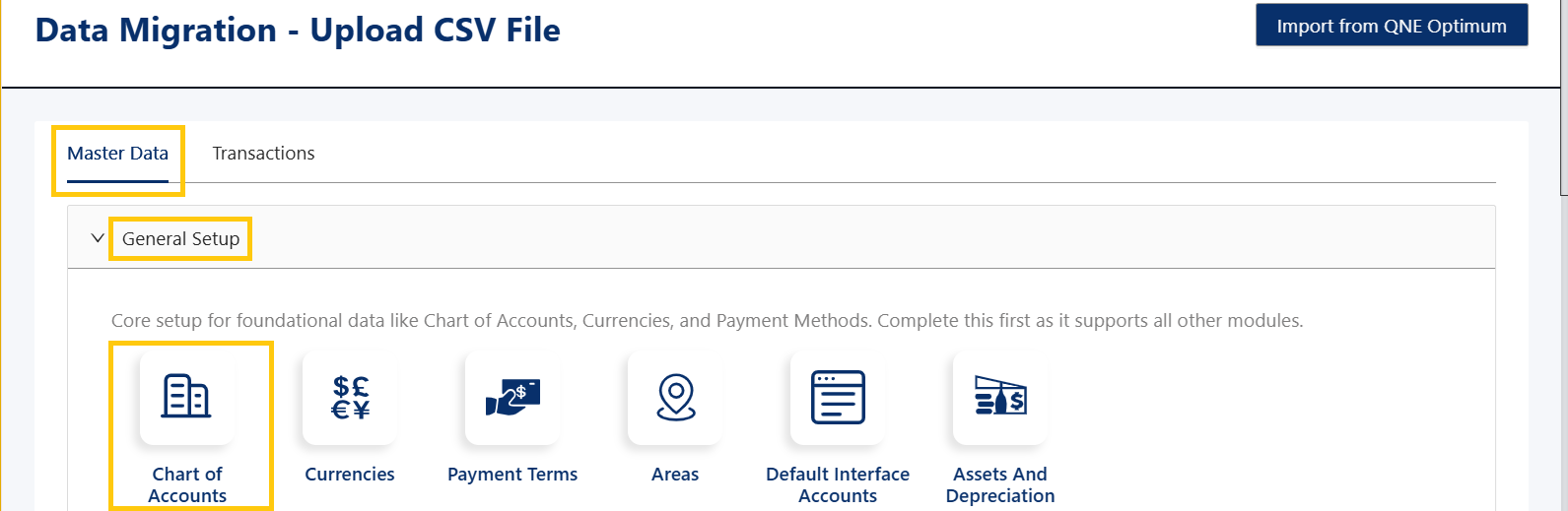 In the Data Migration screen, under Master Data and then General Setup, click Chart of Accounts