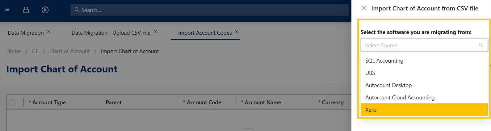 Select the external software you are migrating from (e.g., QuickBooks, Xero, or other accounting systems).