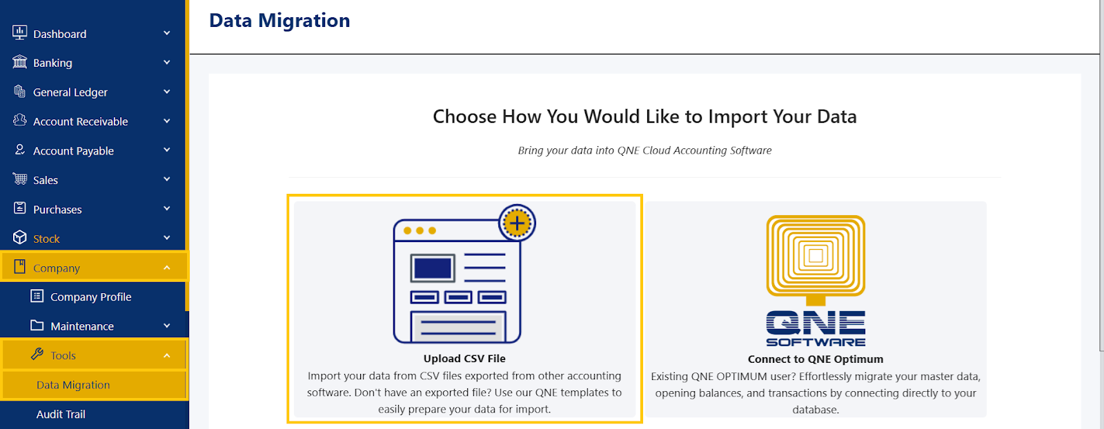 Navigate to Company > Tools > Data Migration. Click Upload CSV File to proceed.