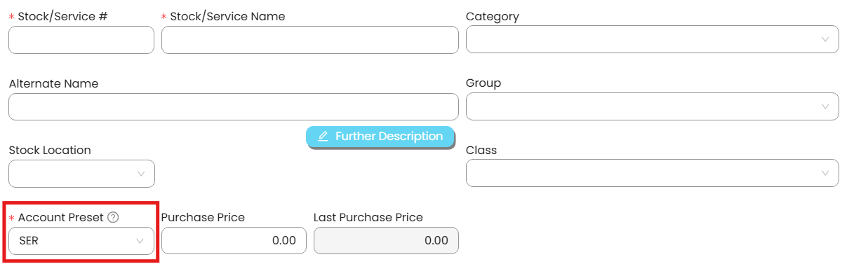 Once created, the Account Preset becomes available when adding or editing stock and service items. By selecting a preset during item setup, you ensure the correct GL accounts are applied automatically for all related transactions—credit sales, cash sales, returns, purchases, and purchase returns.