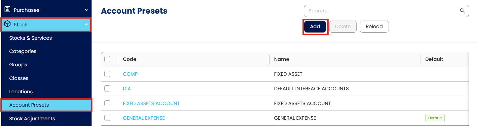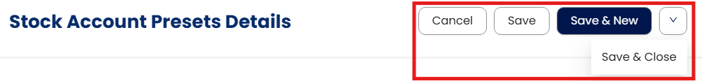 Navigate to Stock > Account Presets, then click Add to open the Stock Account Preset Details screen.