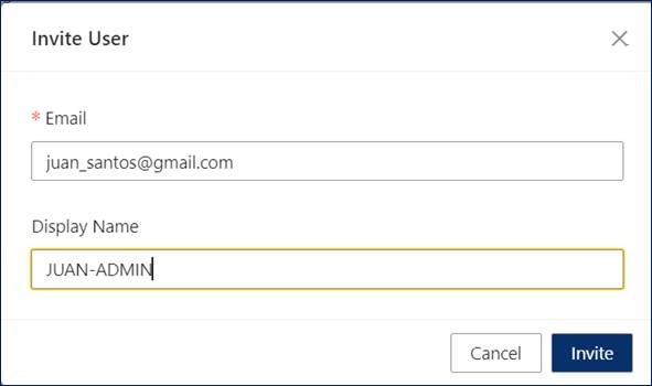 In the pop-up window, enter the user's Email Address and Display Name, then click Invite to proceed.
