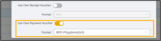Use Own Payment Voucher: If toggled ON, users can select a running number for Payment Voucher and Pay Bills transactions, activating a dropdown for available numbering options.