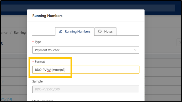 From the dropdown, select the newly created running number format (e.g., BDO-PV{yy}{mm}/{n3}).