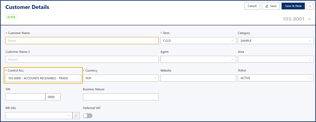 When adding a new customer, the Control Account field will auto-fill with the defined customer control account, ensuring all receivables are properly tracked.