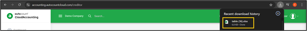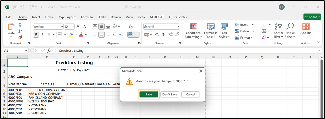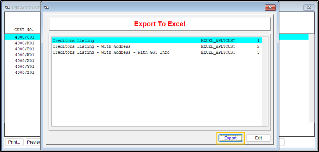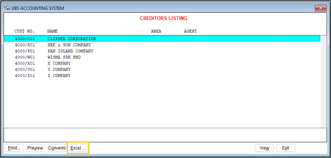 On the Creditors Listing pop-up window, click Excel.