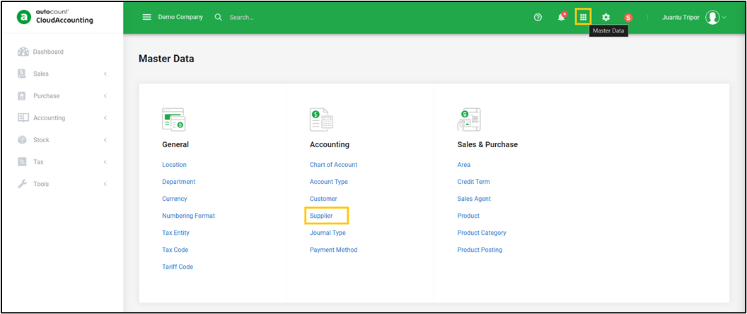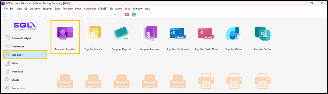 Upon logging in to SQL Accounting, on the Navigation Pane, click General Ledger > Maintain Supplier.