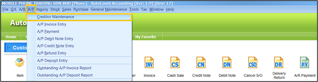 Upon logging in to Autocount Desktop, on the Ribbon Tab, click A/P > Creditor Maintenance.