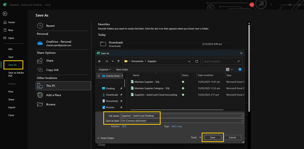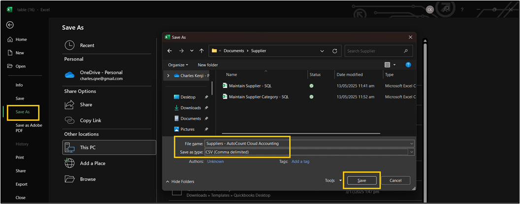 Save and open the Excel File. Navigate to File > Save As, then enter your chosen file name, and change the Save as type to CSV (Comma delimited). Once you're finished, click Save.