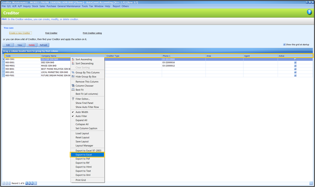 On the Creditor Type Maintenance List View screen, right-click on the table header, then select Export to Excel