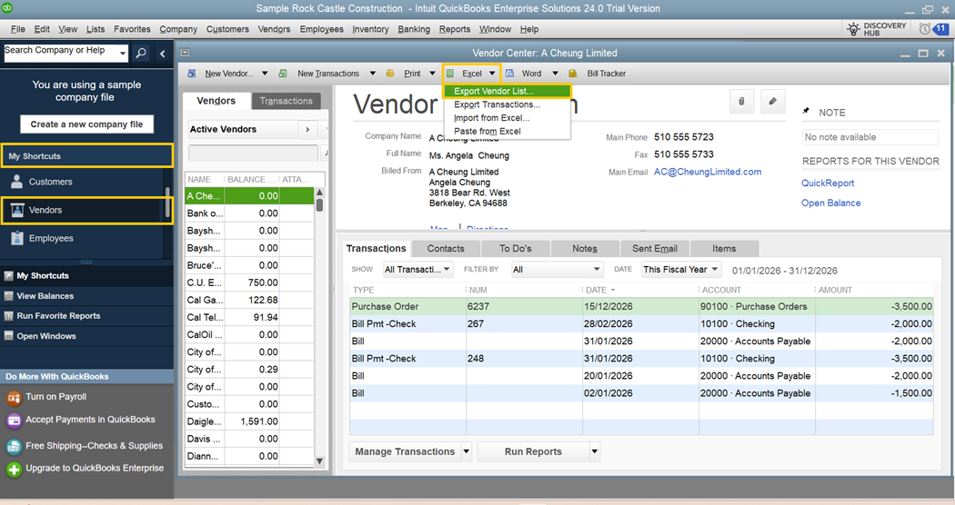 Upon logging in to QuickBooks Desktop, under Shortcuts, click Customers, then click Excel > Export Customer List.
