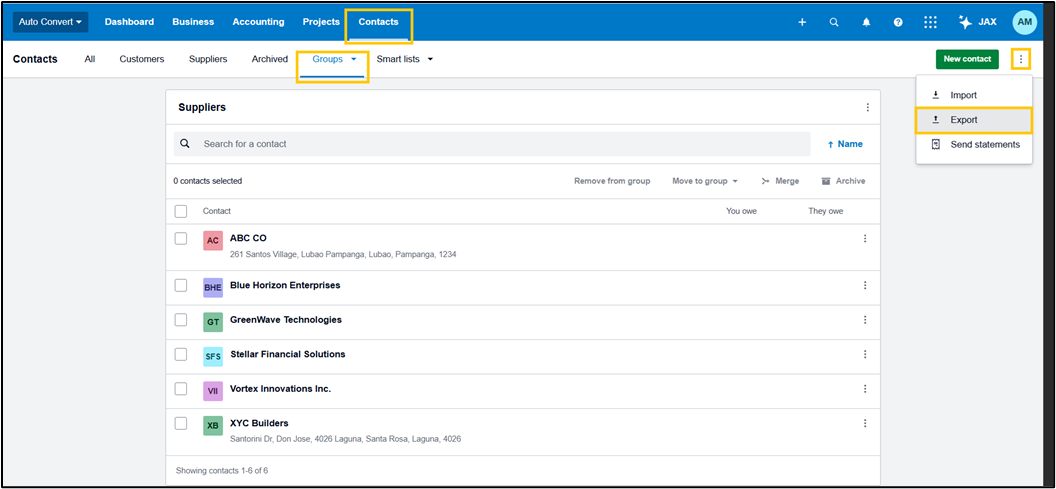 Upon logging in to Xero, on the ribbon tab, click Contacts > Groups or Customers > Ellipses (...) > Export.
