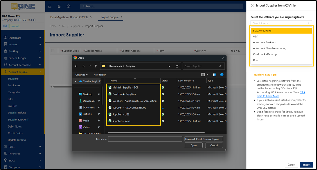 Export suppliers from SQL Accounting, UBS, Autocount Cloud Accounting, Autocount Desktop, QuickBooks Desktop, and Xero, and then import them into QNE AI Cloud Accounting.