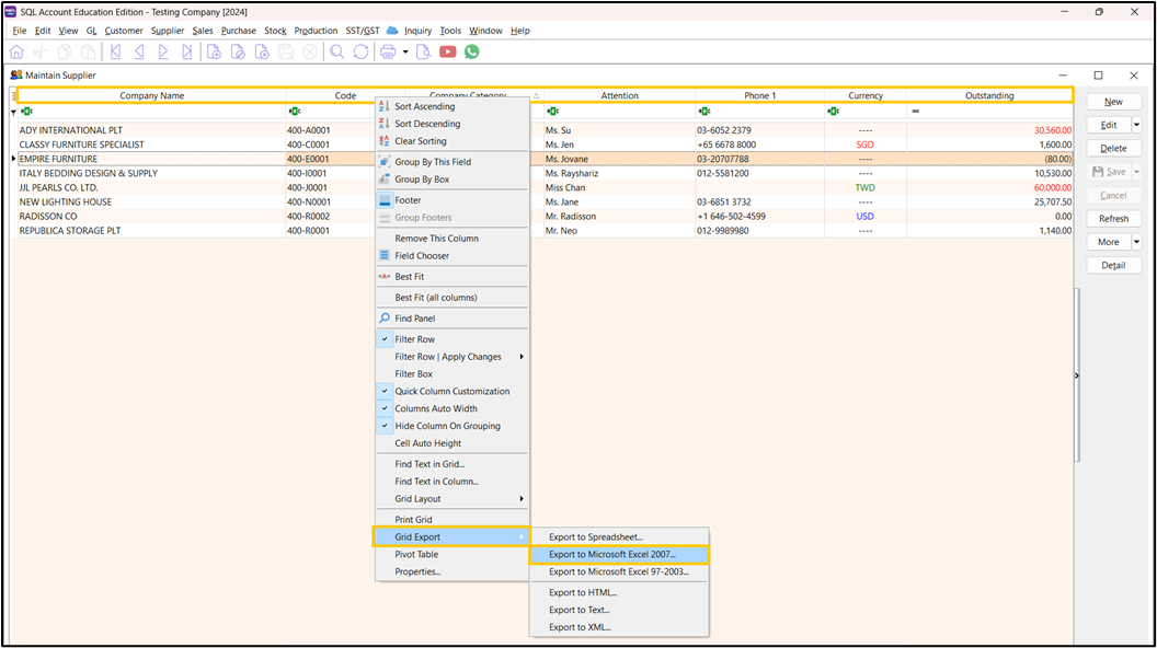 On the Supplier List View screen, right-click on the table header, select Grid Export > Export to Microsoft Excel 2007.