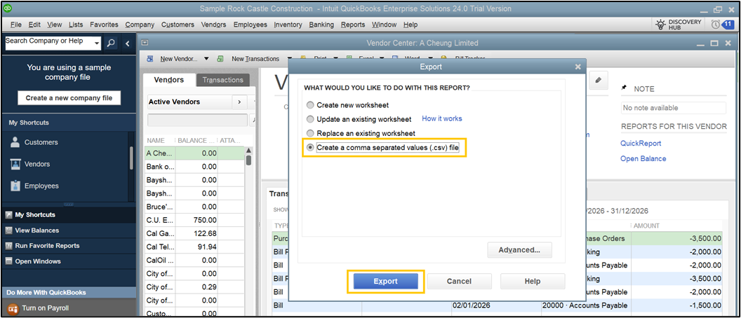 On the Export pop-up window, select Create a comma-separated values (.csv) file, then click