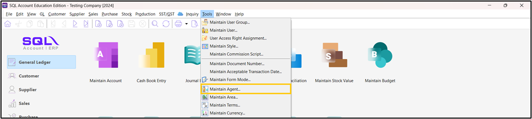Upon logging in to SQL Accounting, on the Ribbon Tab click Tools > Maintain Agent.