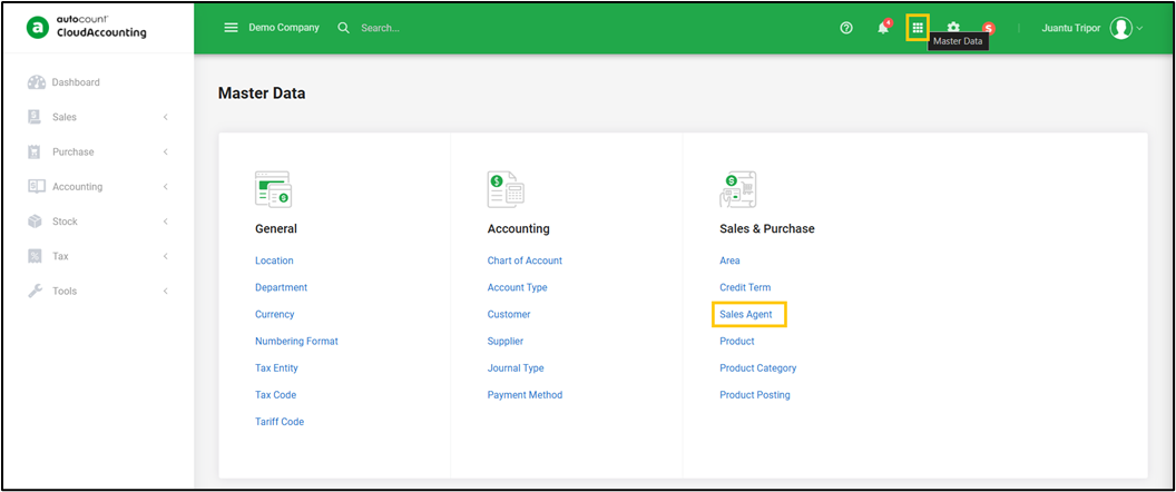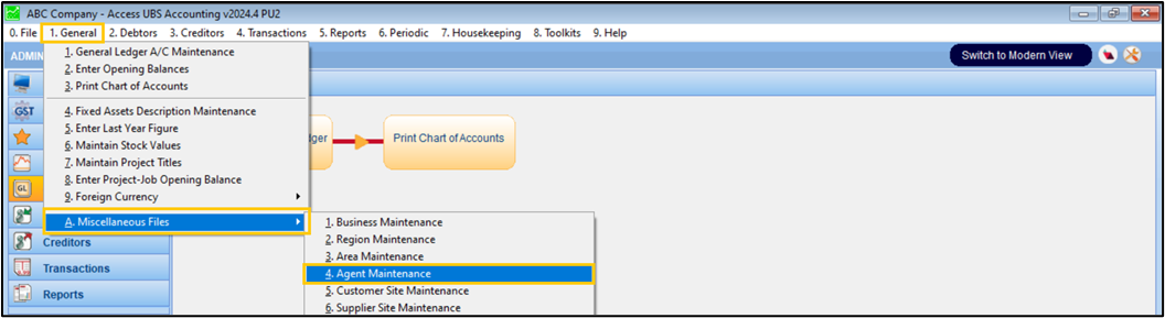 Upon logging in to Autocount Desktop, on the Ribbon Tab click General Maintenance > Sales Agent Maintenance.