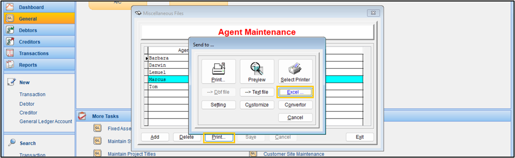 On the Agent Maintenance pop-up window, click Print. And on the Sent to ... pop-up window, Excel.