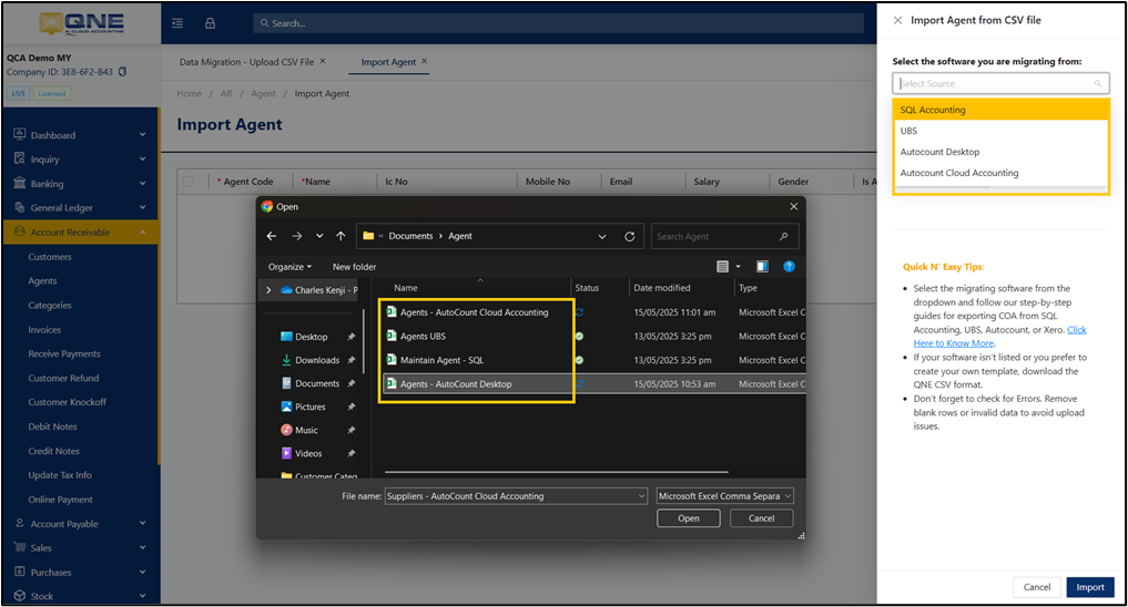 Export agents from SQL Accounting, UBS, Autocount Cloud Accounting, and Autocount Desktop, and then import it into QNE AI Cloud Accounting.