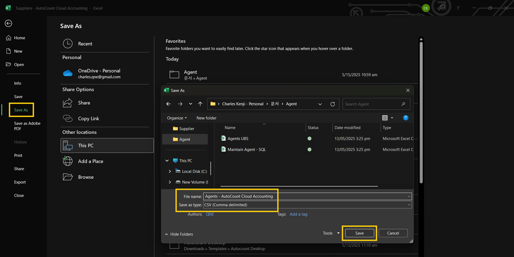 Save and open the Excel File. Navigate to File > Save As, then enter your chosen file name, and change the Save as type to CSV (Comma-delimited). Once you're finished, click Save.