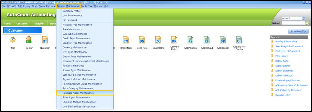 Upon logging in to Autocount Desktop, on the Ribbon Tab, click General Maintenance > Purchase Agent Maintenance.