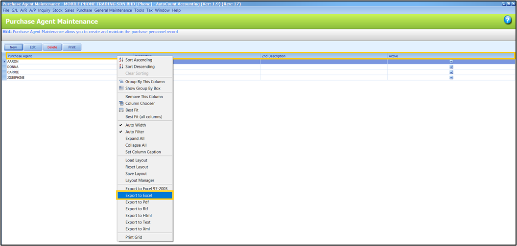 On the Purchase Agent Maintenance list view, right-click on the table header, then select Export to Excel.