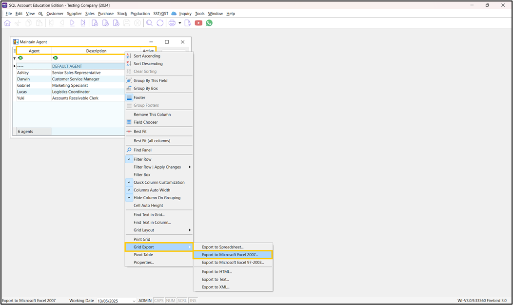 On the Maintain Agent pop-up window, right-click on the table header, select Grid Export > Export to Microsoft Excel 2007.