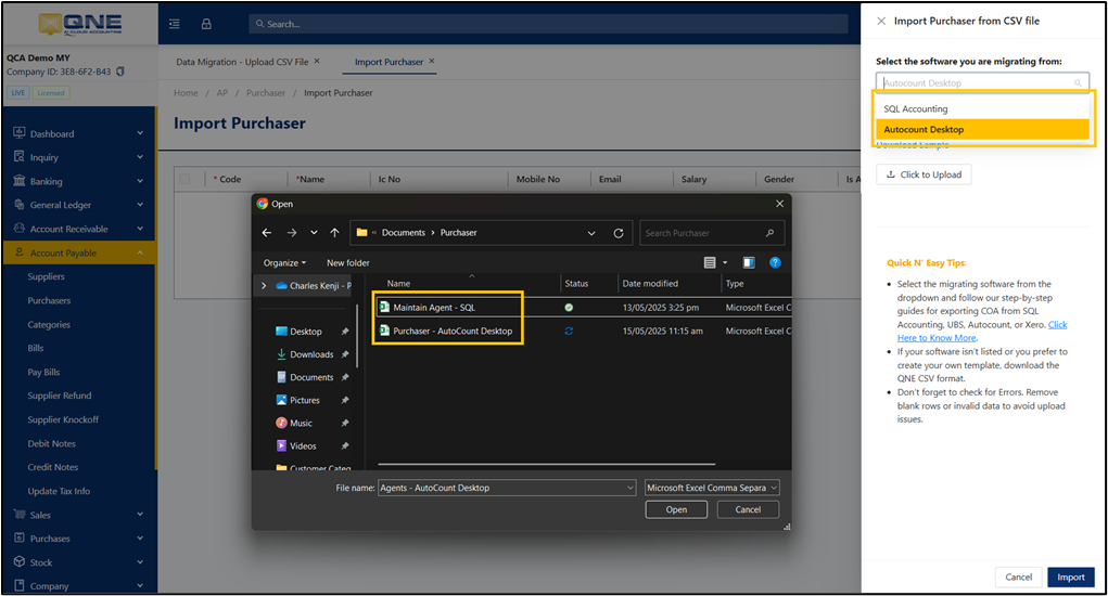 Export Purchasers from SQL Accounting, and Autocount Desktop, and then import it into QNE AI Cloud Accounting.