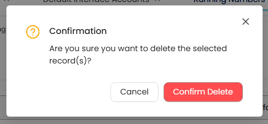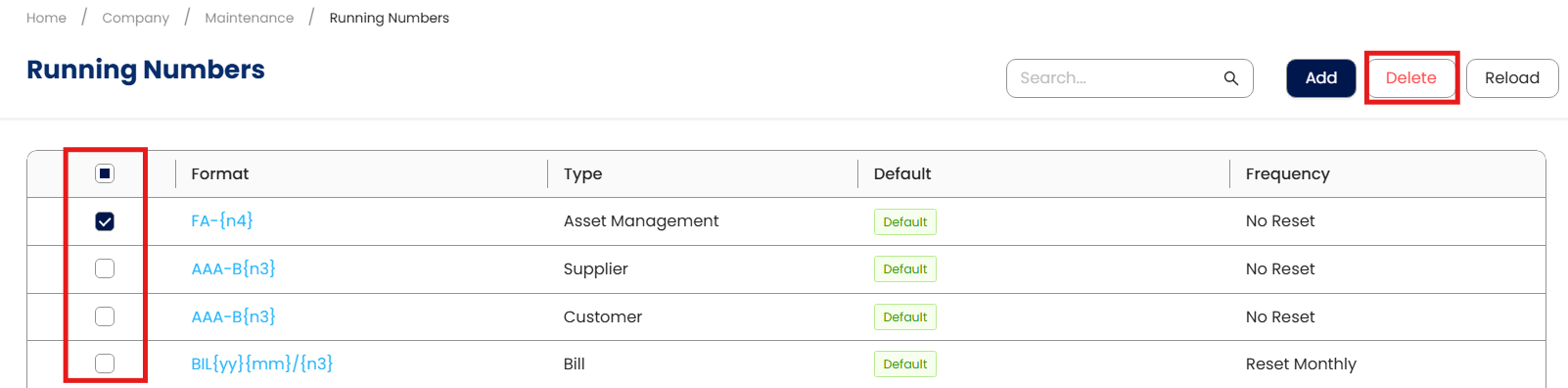 In the Running Numbers List View, tick the checkbox beside the item you wish to delete. Hover your cursor over the three dots beside "Add," then click Delete.