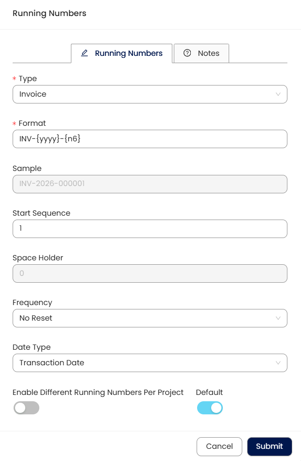 Once all required fields are completed, click Submit to apply and save the running number format.