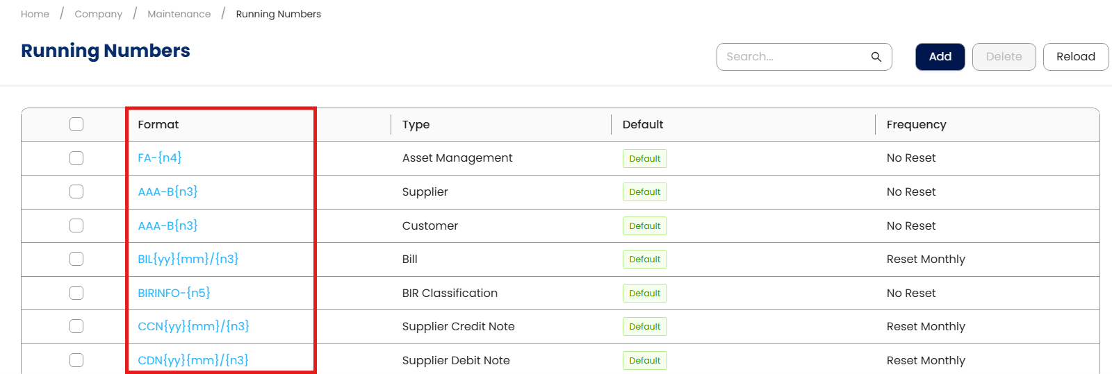 Navigate to Company > Maintenance > Running Numbers, then click Add to create a new running number entry.