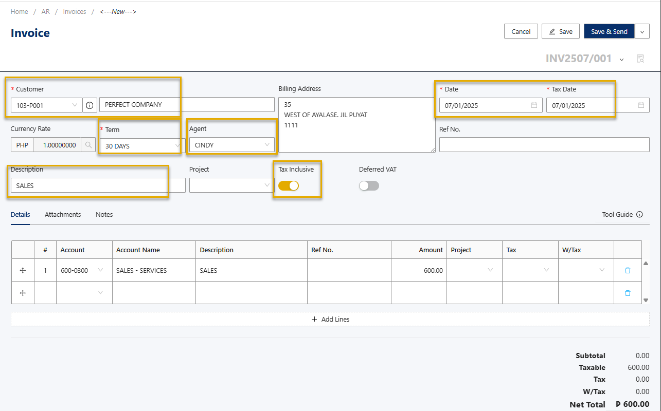 Tax – Choose a tax code (e.g., Vatable 12%) if applicable.
