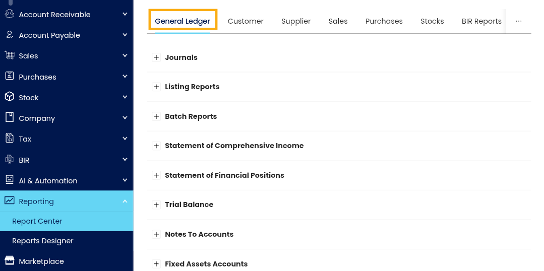2. Click on the General Ledger tab at the top of the Report Center.